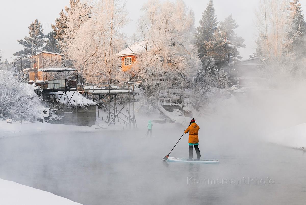 Участники клуба SUP_Novosibirsk во время занятий сапсерфингом на притоке реки Обь в -31 градус