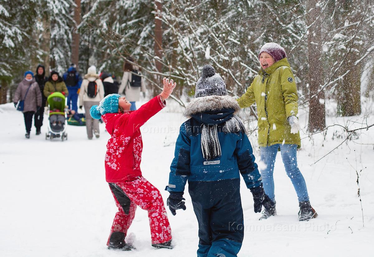 Дети гуляют в парке. Снежная горка. Дети катаются на ватрушке