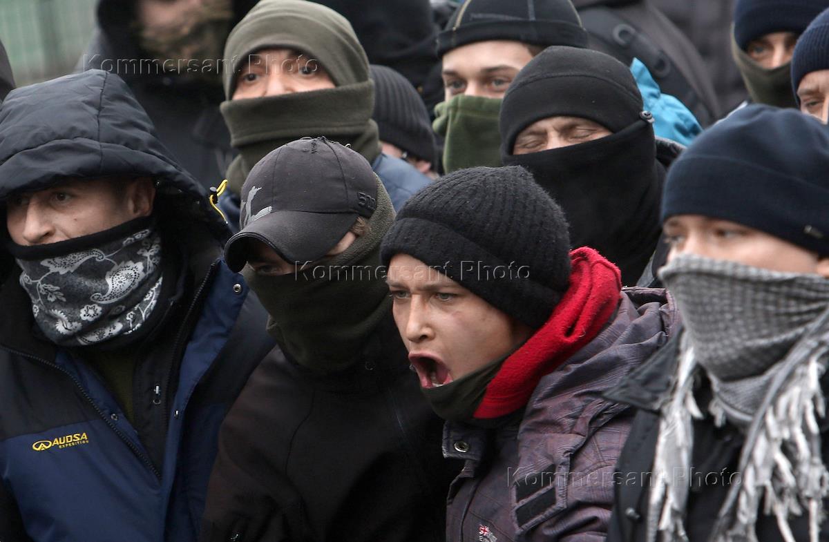 Сотрудники правоохранительных органов и националисты во время столкновений у здания телеканала "НАШ".