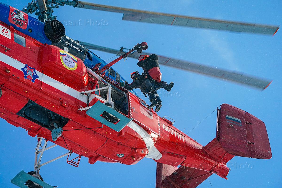 Происшествия и конфликты Пресс-тур Московского авиационного центра (МАЦ) Департамента по делам гражданской обороны, чрезвычайным ситуациям и пожарной безопасности ГОЧСиПБ города Москвы ко Дню работника гражданской авиации - 9 февраля. Сотрудники МАЦ во время показательной тренировки службы воздушных спасателей с участием нового пожарного вертолета Ка-32А11ВС.