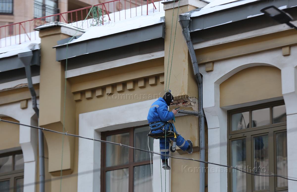 Виды Москвы. Жанровая фотография. Сотрудник службы промышленных альпинистов во время изучения фасада…
