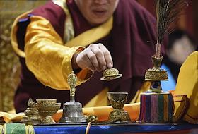 Священнослужитель во время обряда Дугжууба накануне празднования Сагаалгана (Цагаан сар) (Буддийский…