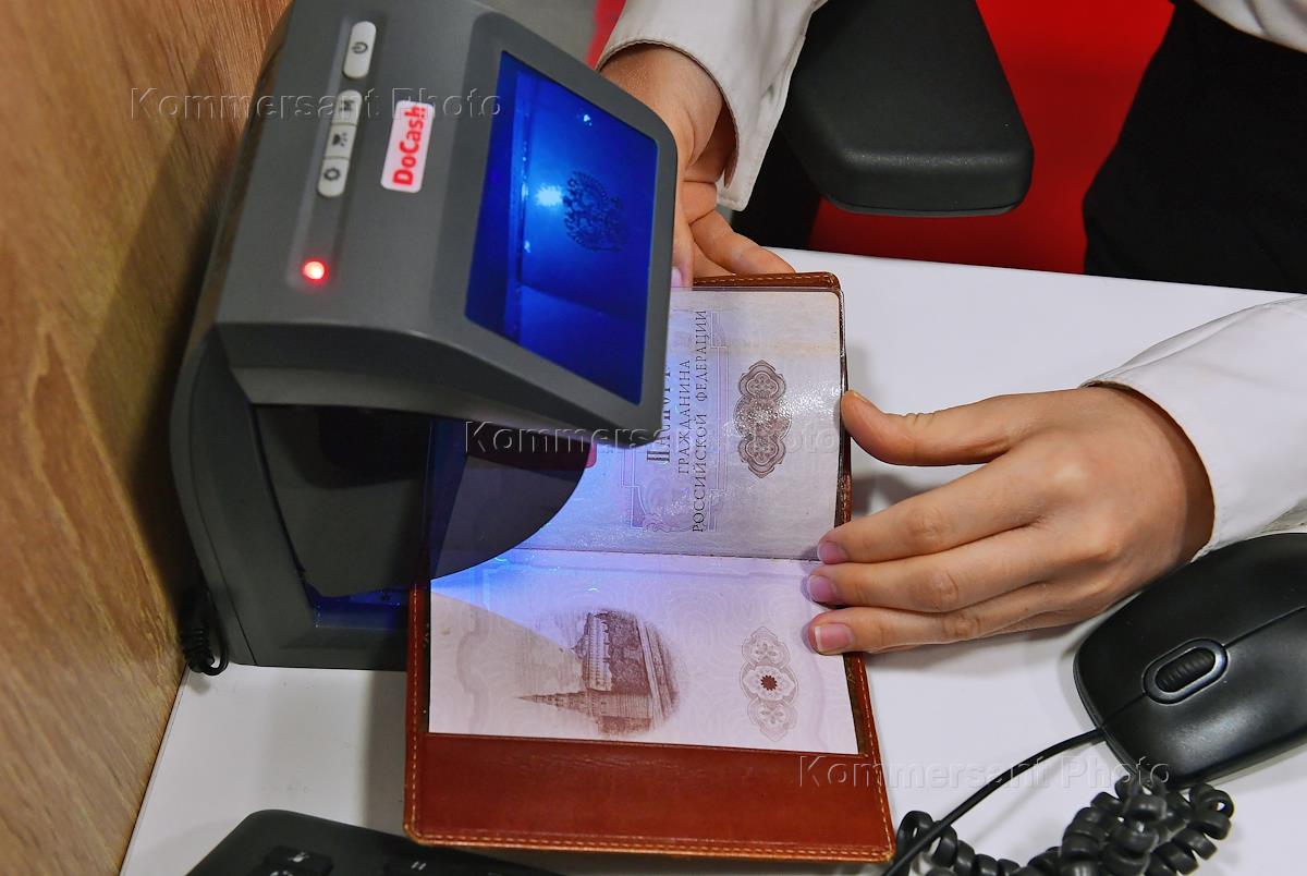 Отделение МТС Банка. Жанровая фотография. Сотрудница банка проверяет паспорт клиента.