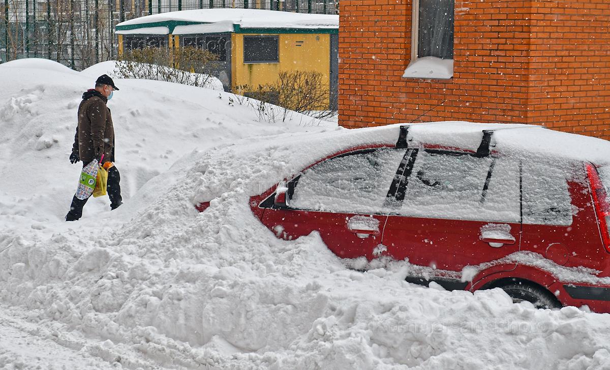 Виды Москвы во время снегопада. Жанровая фотография. Очистка автомобиля от снега.