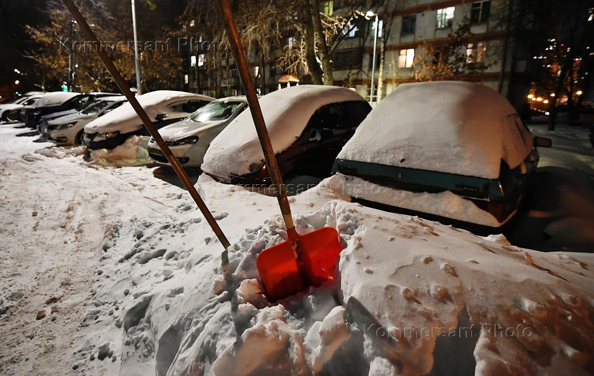 Виды Москвы во время снегопада. Жанровая фотография. Лопата для уборки снега на фоне занесенных…
