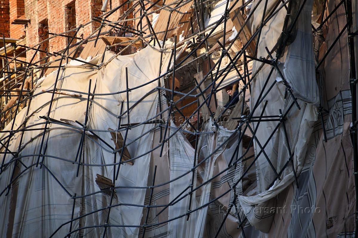 Обрушение строительных лесов в Лубянском проезде. Строительные леса, установленные на фасаде…