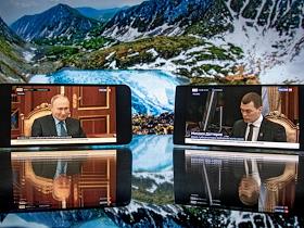 Жанровая фотография. Трансляция встречи президента России Владимира Путина и временно исполняющим…