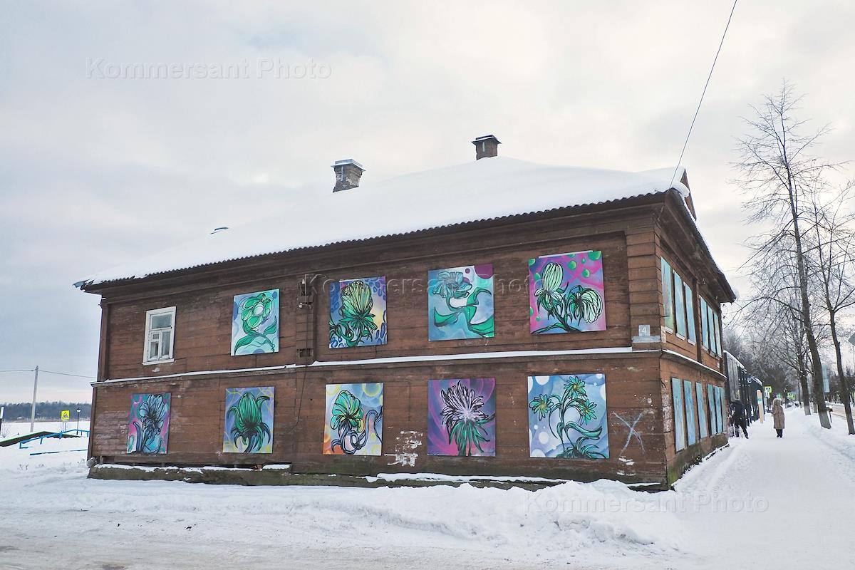 Виды Новой Ладоги. Жанровая фотография. Картины на оконных проемах старинного деревянного дома.