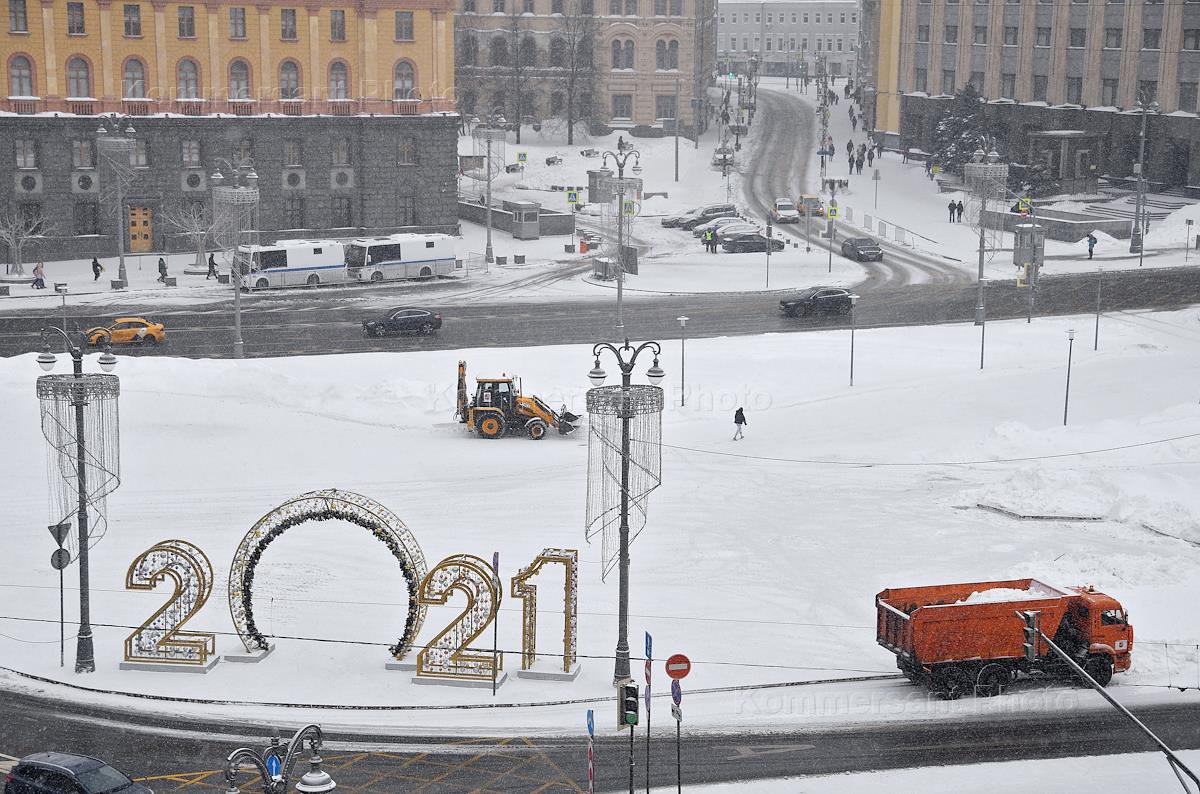 Виды Москвы после снегопада. Уборка снега на Лубянской площади.