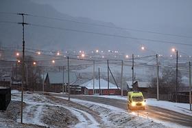 Жанровые фотографии. Зимние виды Республики Алтай. Реанимобиль (экипаж скорой помощи) едет по…