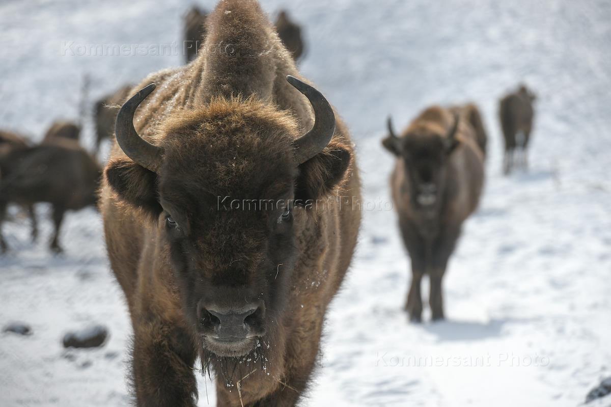 Жанровые фотографии. Зимние виды Республики Алтай. Зубровый питомник на Алтае. Зубр на территории…