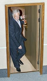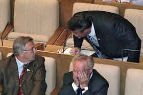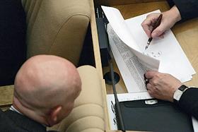 Заседание Государственной Думы России. Депутат рисует на документе чернильной ручкой "человечков" и…