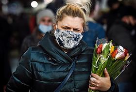 Жанровая фотография. Продажа цветов к 8 марта на Рижском цветочном рынке. Сотрудник Росгвардии с…
