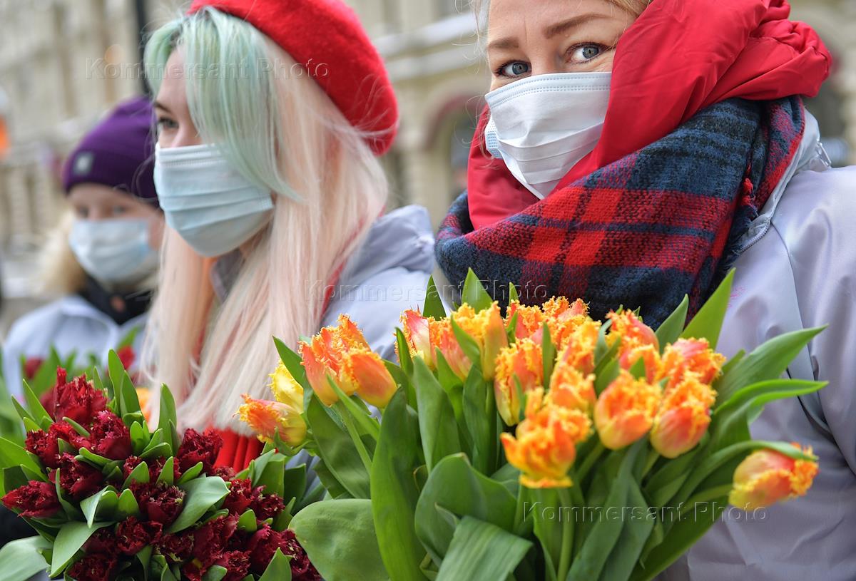 Акция "Вам, любимые", приуроченная к празднованию Международного женского дня. Добровольцы дарят цветы у Большого театра и Никольской улице.