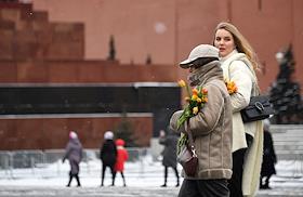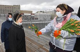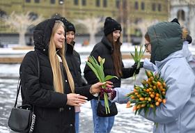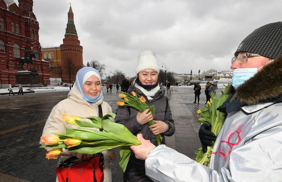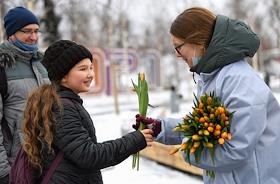 Акция "Вам, любимые", приуроченная к празднованию Международного женского дня. Добровольцы дарят цветы в парке "Зарядье".