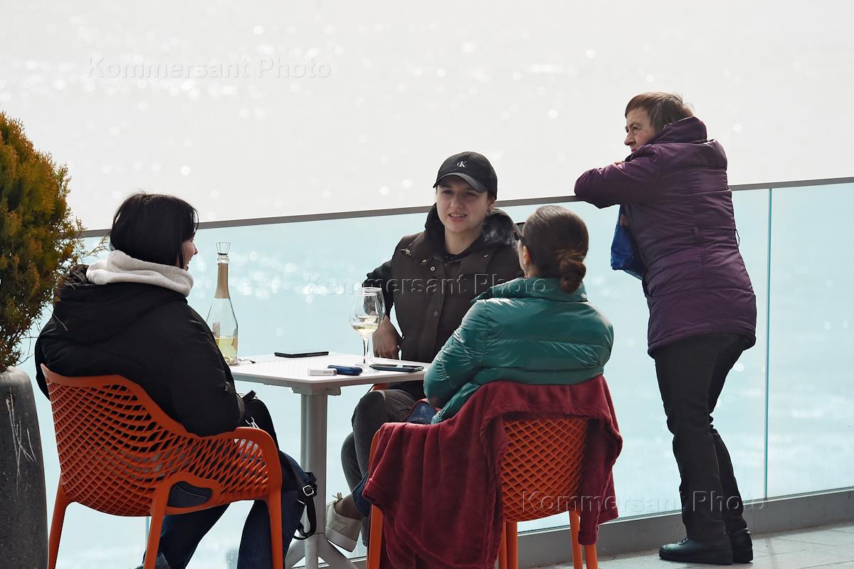 Виды Ялты. Жанровая фотография. Отдыхающие за столиком кафе на набережной.