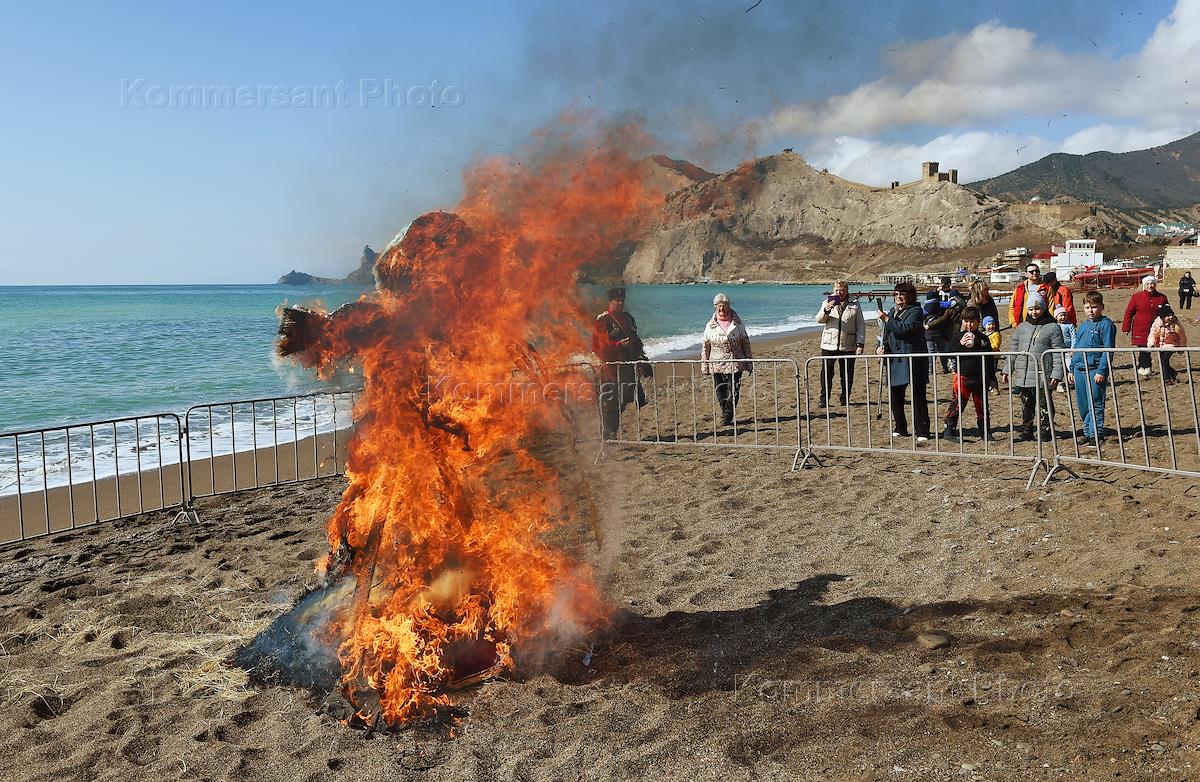 Празднование "Широкой Масленицы" в Крыму. Жанровая фотография. Сжигание чучела Масленицы на пляже…