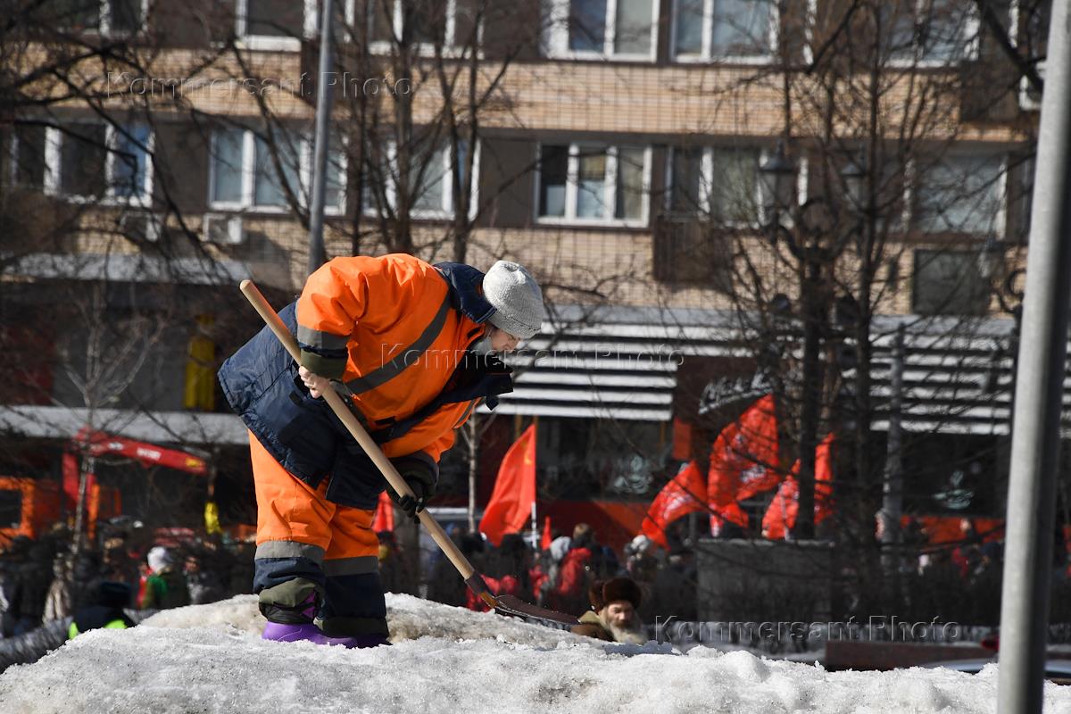 Виды Москвы. Жанровая фотография. Дворник рыхлит снежный сугроб в Новопушкинском сквере.