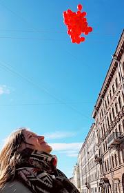 Виды Санкт-Петербурга. Жанровая фотография. Девушка смотрит на связку красных воздушных щаров в…