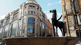Виды Санкт-Петербурга. Жанровая фотография. Большая Конюшенная улица. Скульптура лошади на фоне…