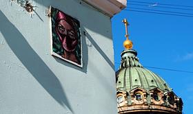 Виды Санкт-Петербурга. Жанровая фотография. Портрет женщины в маске на стене здания. Купол…