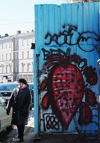 Виды Санкт-Петербурга. Жанровая фотография. Женщина у забора с большим граффити свеклы.