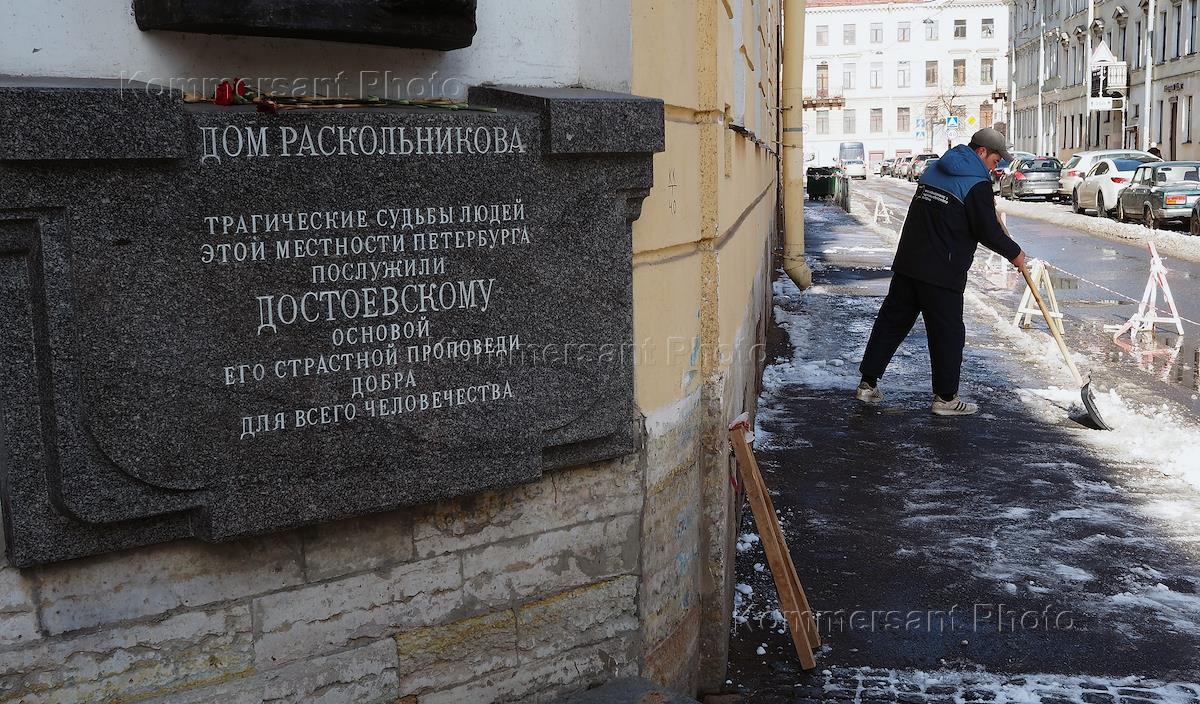 Виды Санкт-Петербурга. Жанровая фотография. Дворник чистит тротуар от снега у "Дома Раскольникова".