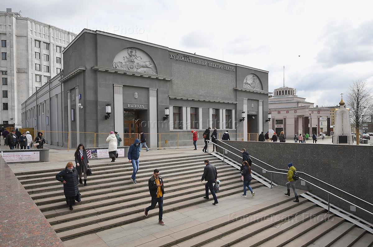 Интерьер кинотеатра "Художественный", открытого после семилетней реконструкции. Посетители в кафе…