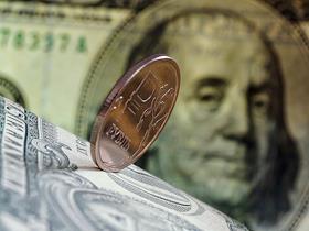 Жанровая фотография. Монеты достоинством 1 рубль лежат на банкноте достоинством 1 доллар.