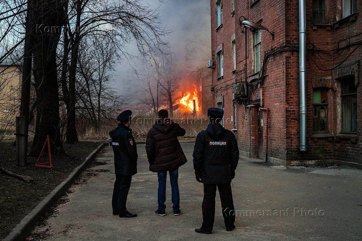 Пожар в здании "Невской мануфактуры" на Октябрьской набережной. Жители близлежащих домов во время…