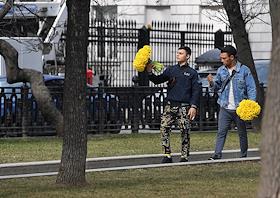 Жанровая фотография. Весна в Москве. Молодые люди с букетами нарциссов идут по аллее бульвара.