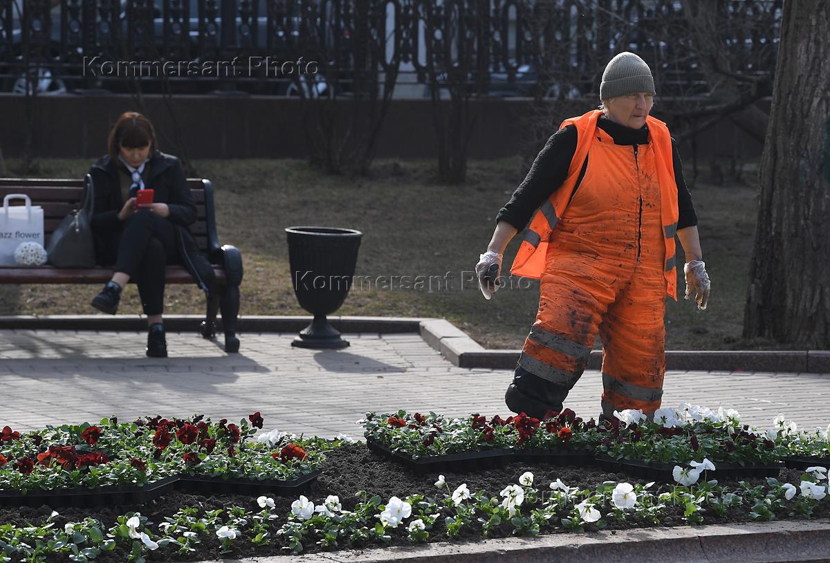 Жанровая фотография. Весна в Москве. Сотрудник коммунальной службы во время высадки цветов на клумбу.