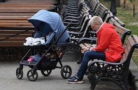 Жанровая фотография. Весна в Москве. Женщина читает мобильный телефон во время прогулке с ребенком в…