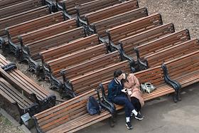 Жанровая фотография. Весна в Москве. Парень с девушкой целуются на скамейке в парковой аллее.