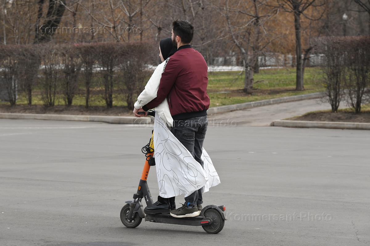 Жанровая фотография. Весна в Москве. Парень с девушкой вдвоем едут на электросамокате.
