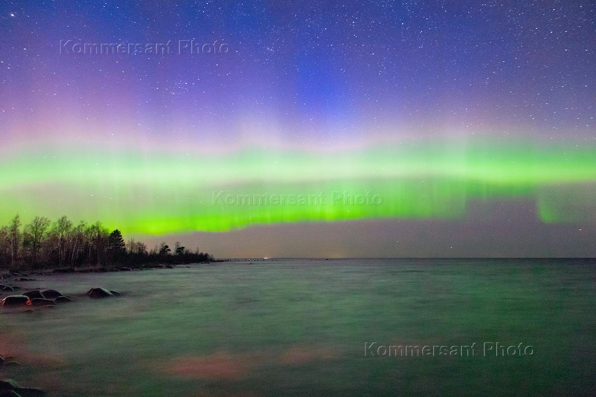 Северное сияние в бухте "Далекая" на берегу Ладожского озера.