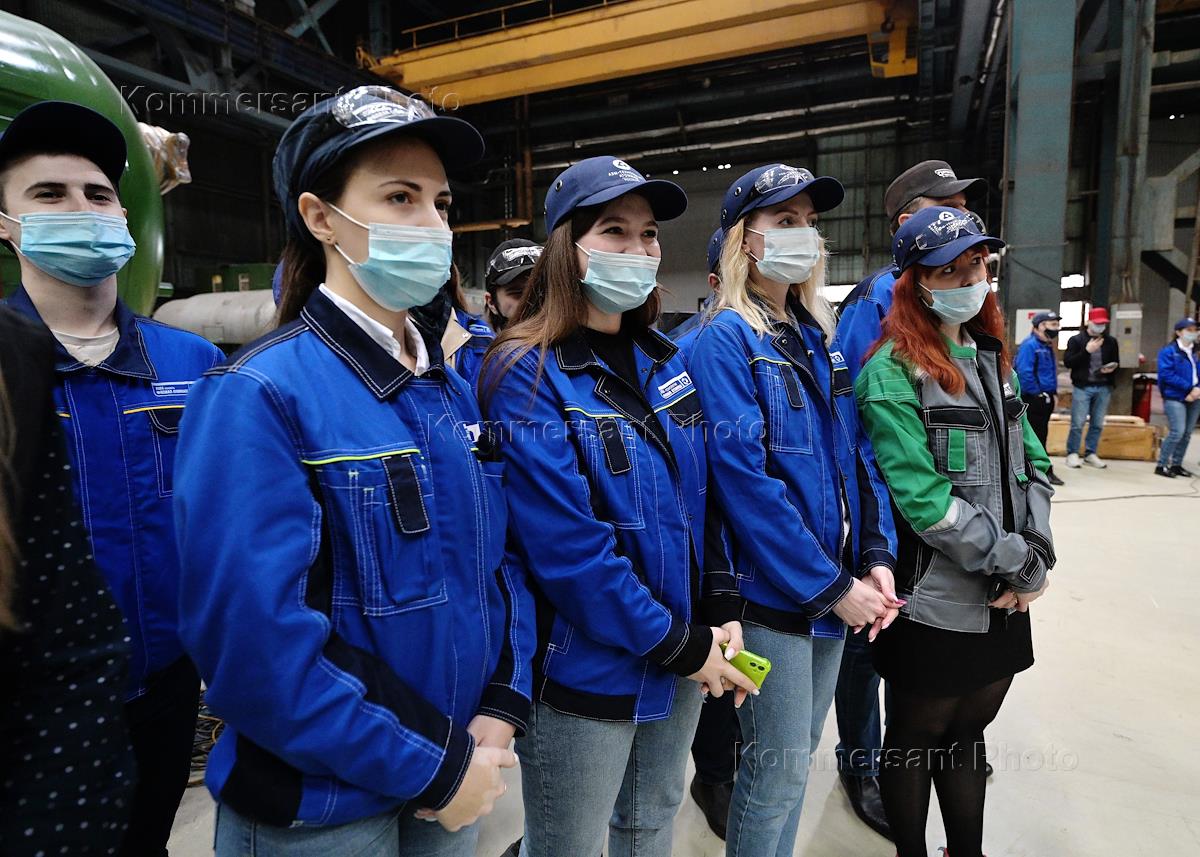 Завод "Атоммаш". Цех сборки ядерных реакторов для энергоблоков строящихся АЭС. рабочие в цехе.
