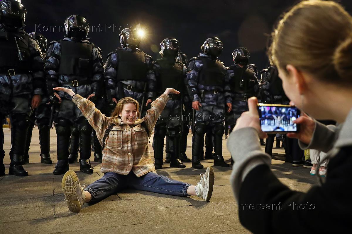 Несогласованная акция в поддержку политика Алексея Навального. Участница акции фотографируется на…