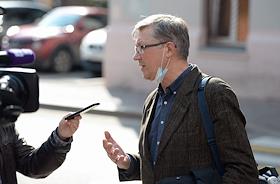 Правосудие Политик Владимир Рыжков у здания Хамовнического районного суда, где рассматривается дело против него об организации проведения несогласованной акции.