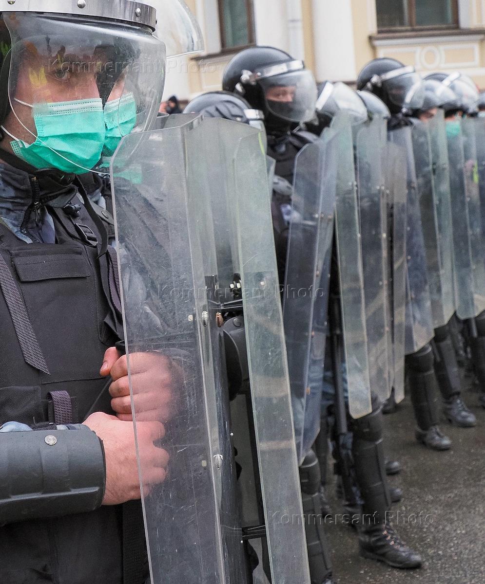 Несогласованная акции в поддержку политика Алексея Навального. Жанровая фотография. Щиты сотрудников…