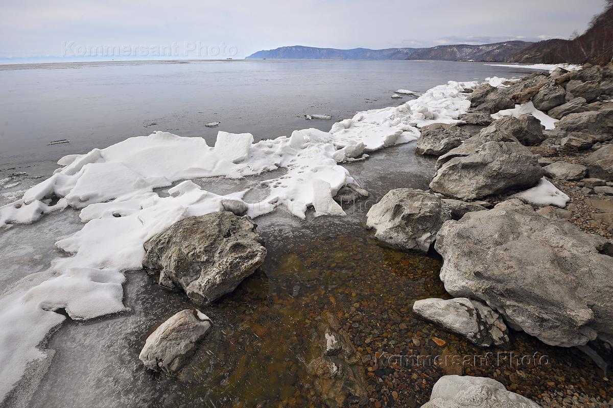 Виды озера Байкал. Жанровая фотография. Дерево среди камней на берегу озера.