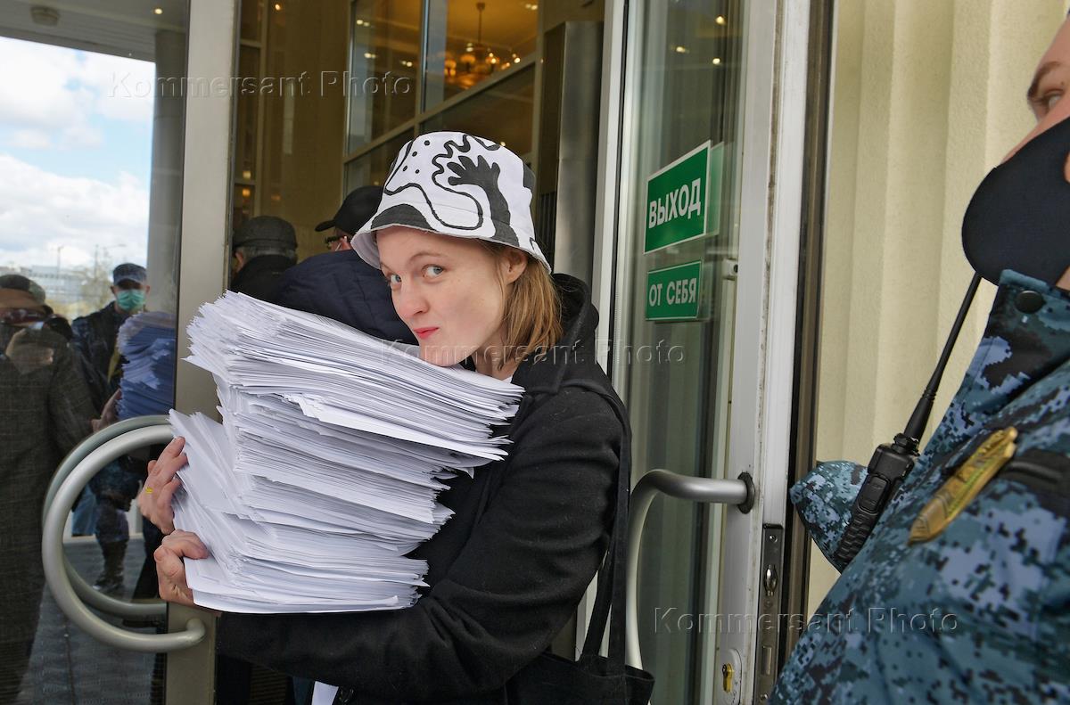 Сотрудница студенческого журнала DOXA у здания Мосгорсуда перед началом рассмотрения жалобы на…