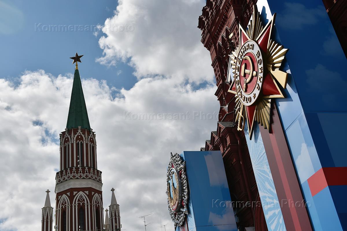 Виды Москвы. Жанровая фотография. Украшение к празднованию Дня Победы на здании Государственного…
