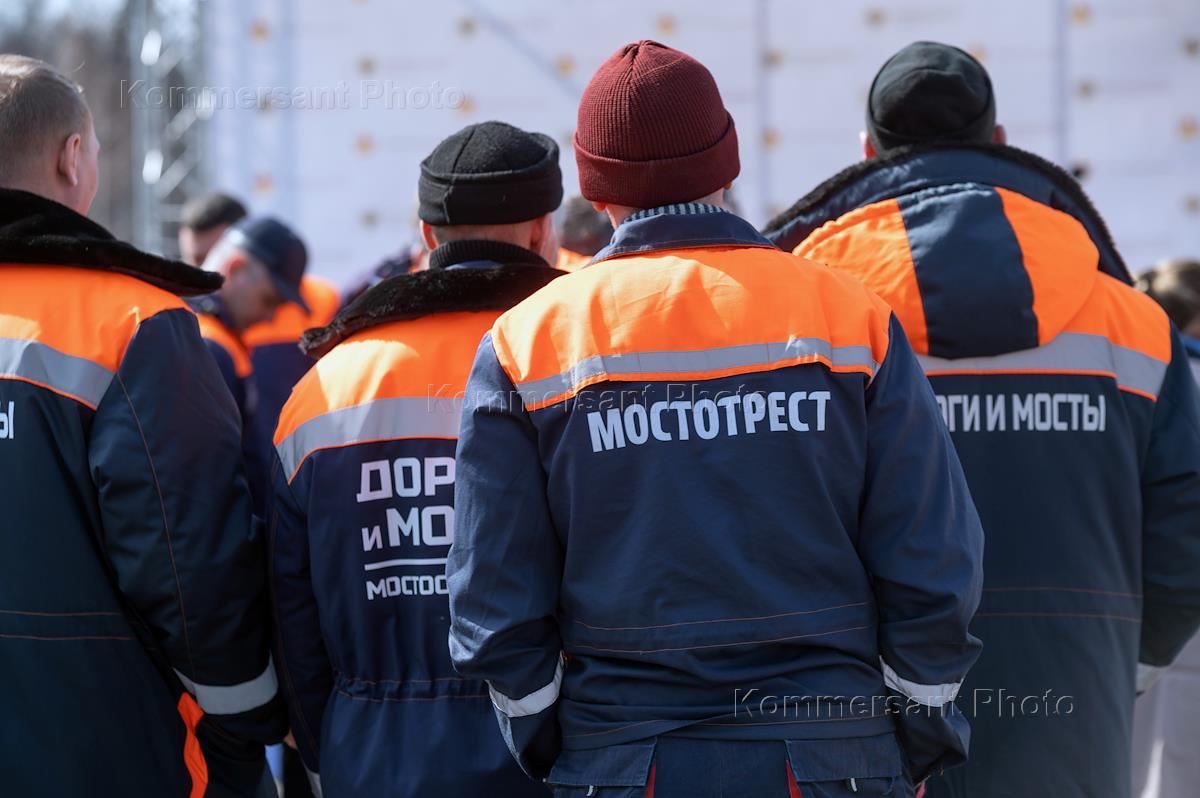 Торжественная церемония открытия дороги в обход города Бобров. Жанровая фотография. Рабочие в форме…