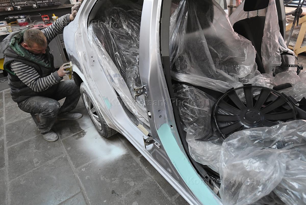 Автосервис Pan Motors. Жанровая фотография. Рабочий во время ремонта автомобиля.