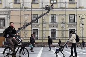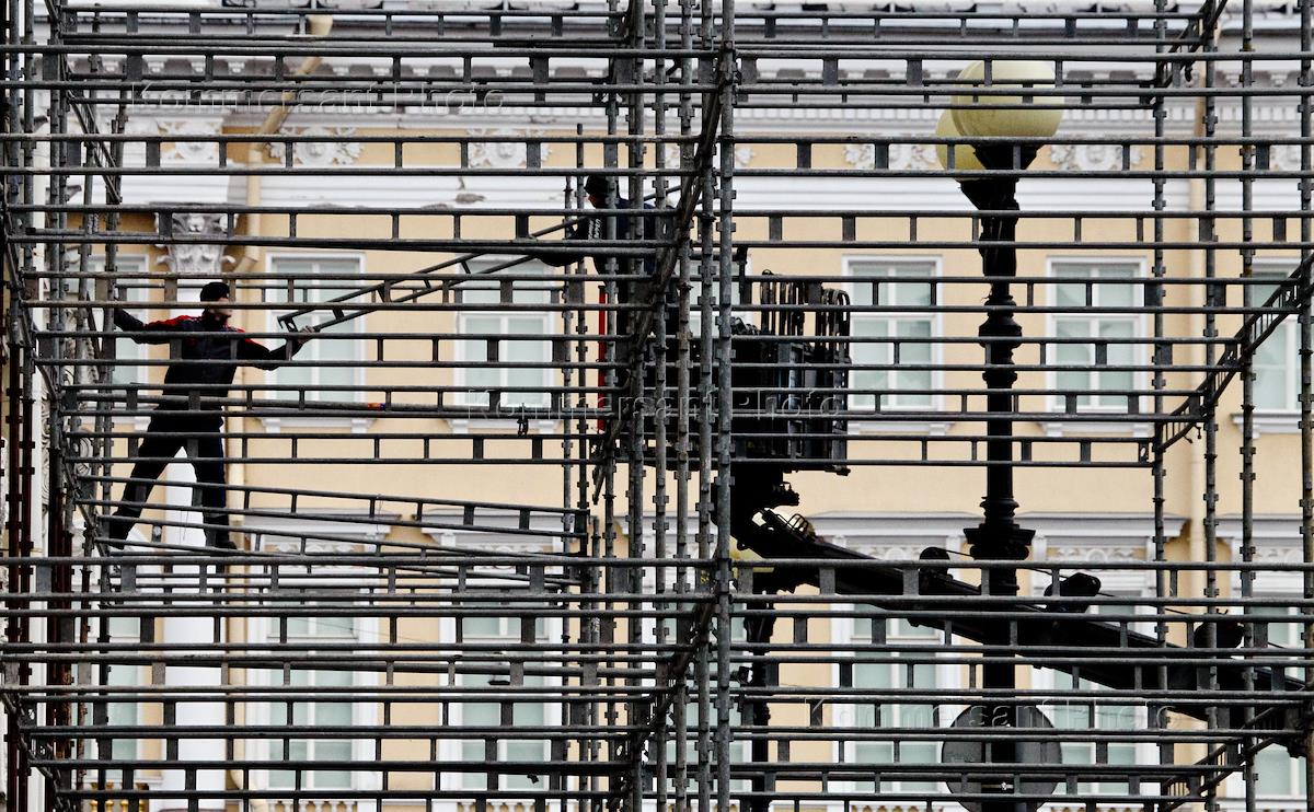 Подготовка к празднованию 76-й годовщины победы в Великой Отечественной Войне. Установка металлических конструкций на Дворцовой площади.
