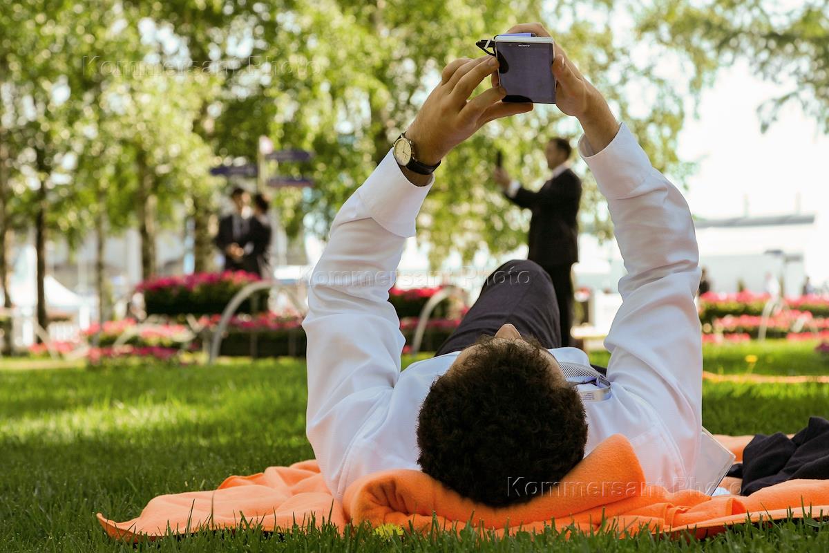 Жанровая фотография. Бизнесмен с сотовым телефоном отдыхает на газоне.