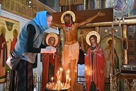 Жанровая фотография. Служительница в церкви поправляет фитиль лампады перед распятием.