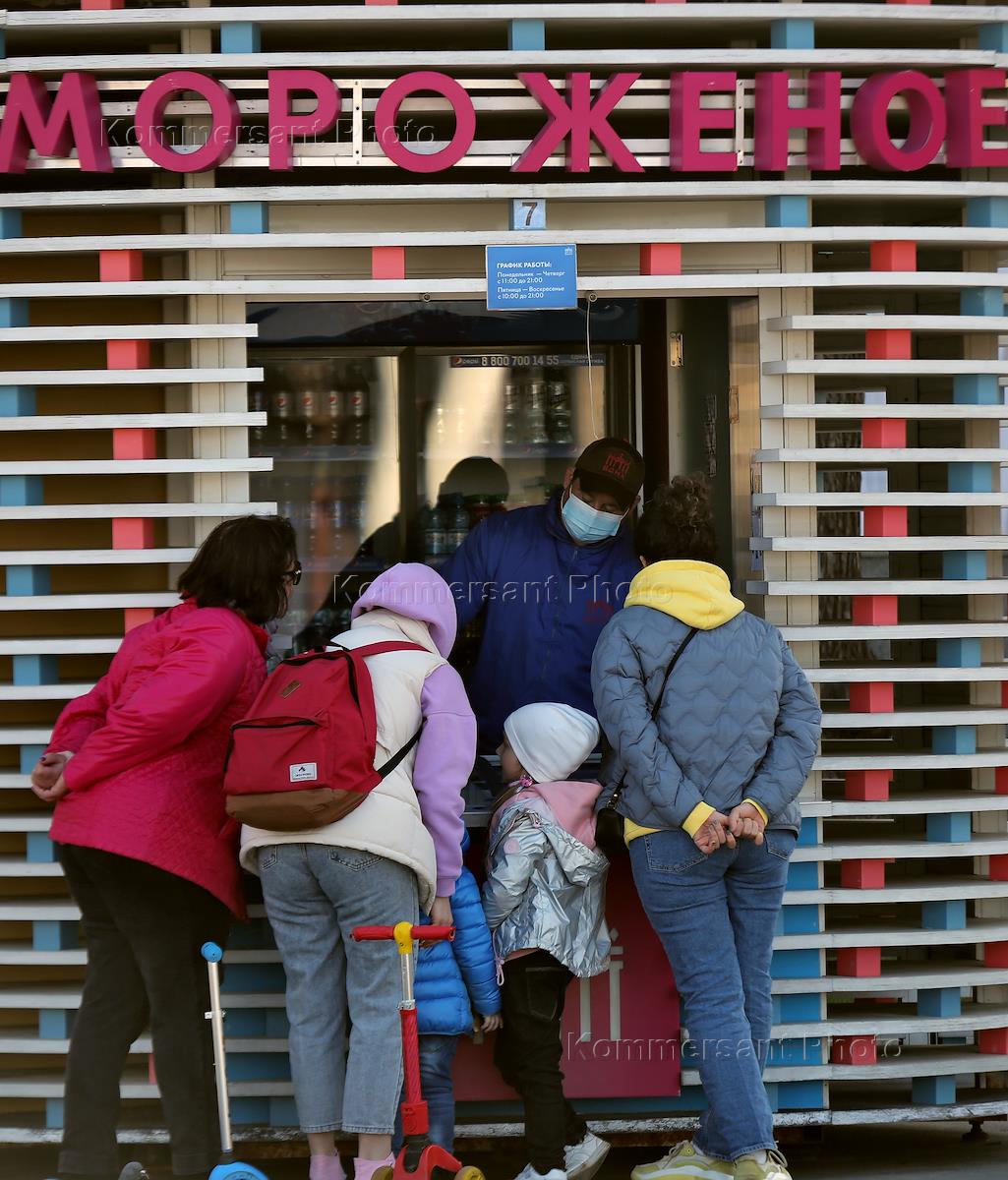 Жанровая фотография. Территория ВДНХ. Посетители у киоска с мороженым.
