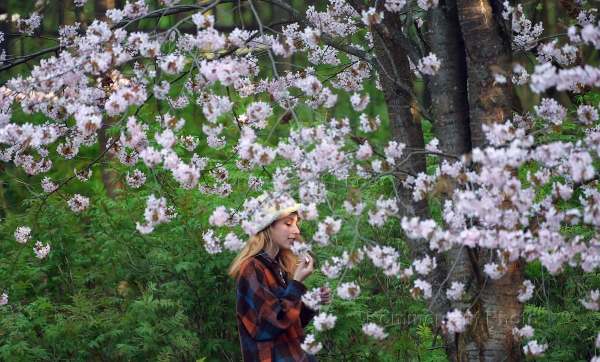 Жанровая фотография. Девушка у цветущей сакуры в Ботаническом саду.